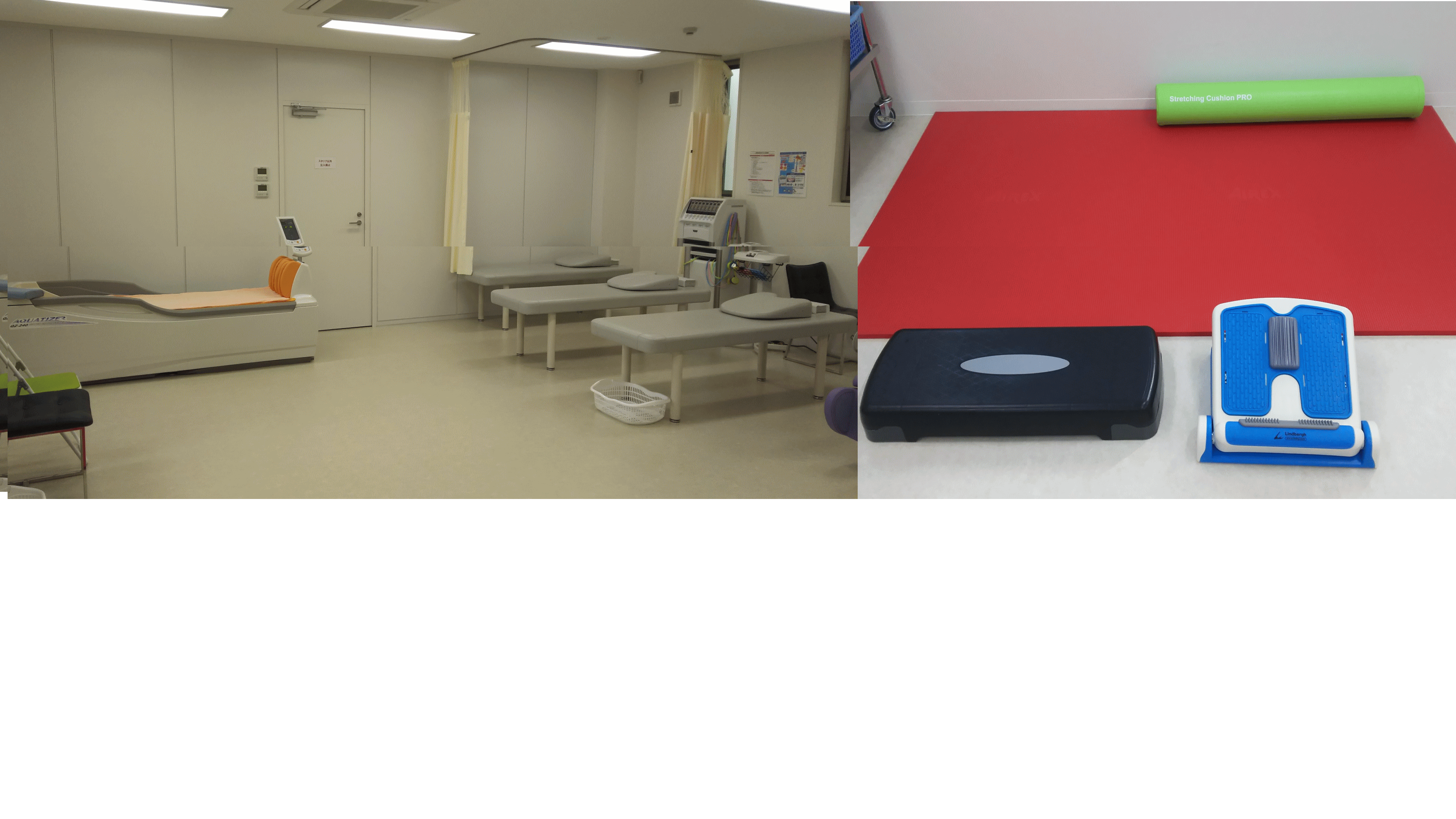 当院2階にはリハビリ器具が設置してあります。患者さんとしっかりお話しさせていただき、症状に合わせた施術を行います。体操をするスペースもありますので、ストレッチや軽い体操も行えます。また2階へはエレベーターがありますので、車いすの方や階段に不安のある方も安心してご利用いただけます。